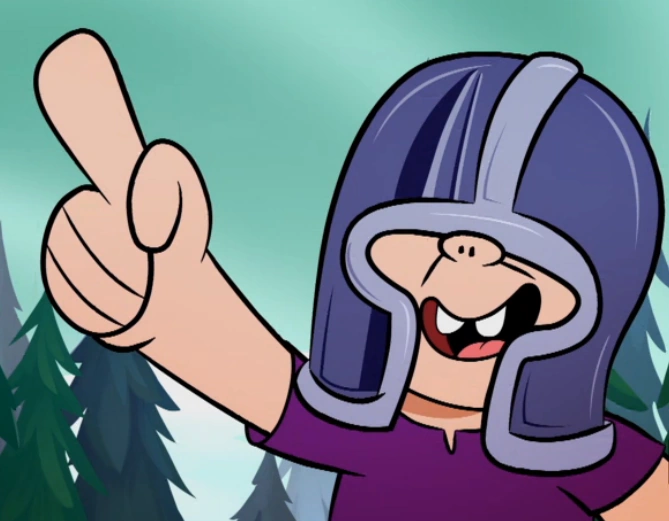 Helmut is known for his signature warrior helmet, and wears a purple shirt, has buck teeth, wears dark blue pants and brown shoes.